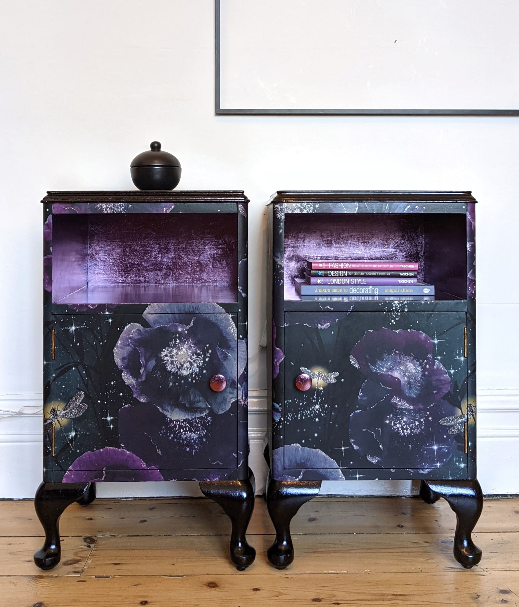 Named after the fairy king and queen in A Midsummer Night’s Dream, they’re wrapped in a beautiful wallpaper of dragonflies, bold florals, and twinkling stars. The cabriole legs and tops are gilded with black metal leaf and finished in a glossy varnish, while the recesses glow with deep purple metal leaf, softly lit by concealed LEDs that double as a night light. The handles are finished in the same purple leaf for the perfect final touch — rich, moody, and just a little bit enchanted.