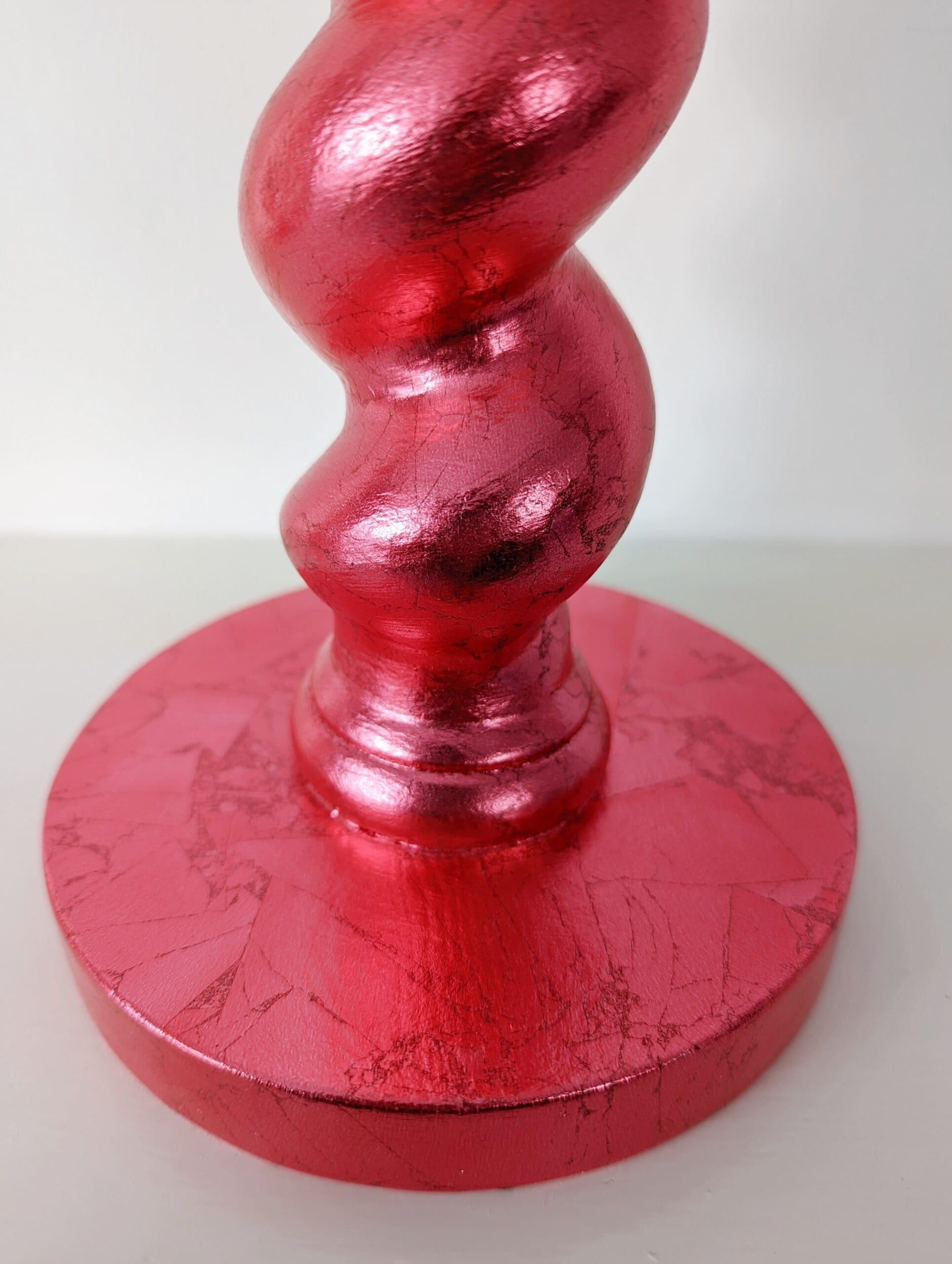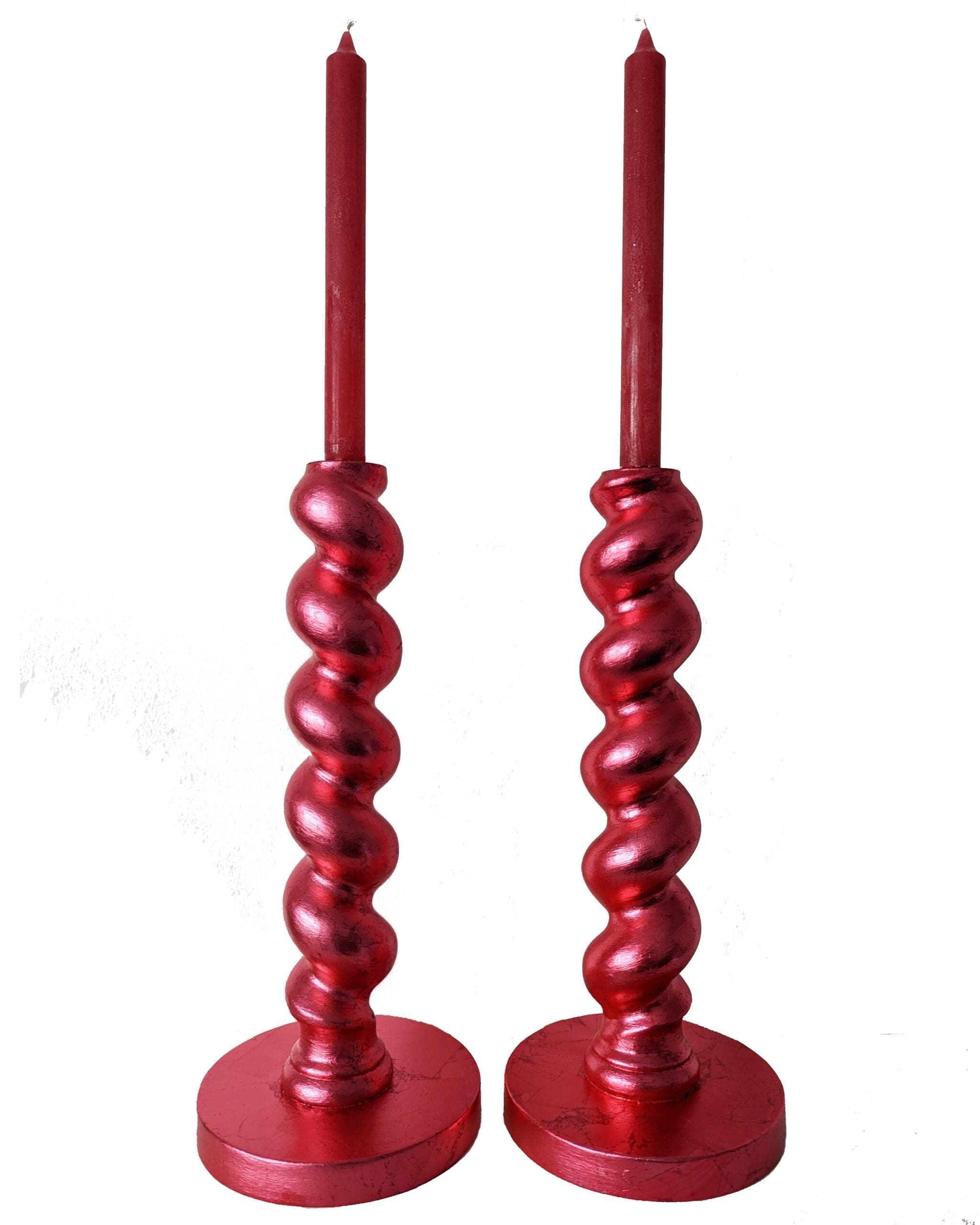These large and luxurious candlesticks have been handcrafted from chunky reclaimed vintage barley twist table legs. They have been gilded with silver leaf which has been carefully applied by hand and varnished for protection. The luxurious metallic finish is a red dyed genuine silver leaf in a beautiful bright pinkish scarlet red. It has a gorgeous soft sheen and natural variations in colour.