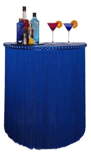 Royal blue demi-lune console table with fringing and gilded bobbin trim