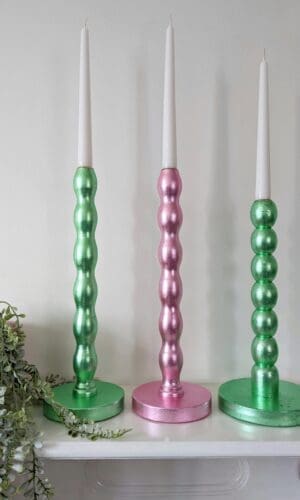 This luxury, sustainable candlestick has been handcrafted from a reclaimed vintage bobbin table leg. It has been gilded with green silver leaf which has been carefully applied by hand and varnished for protection. The luxurious metallic finish is a genuine mint green dyed silver leaf which has a beautiful soft sheen and natural variations in colour.