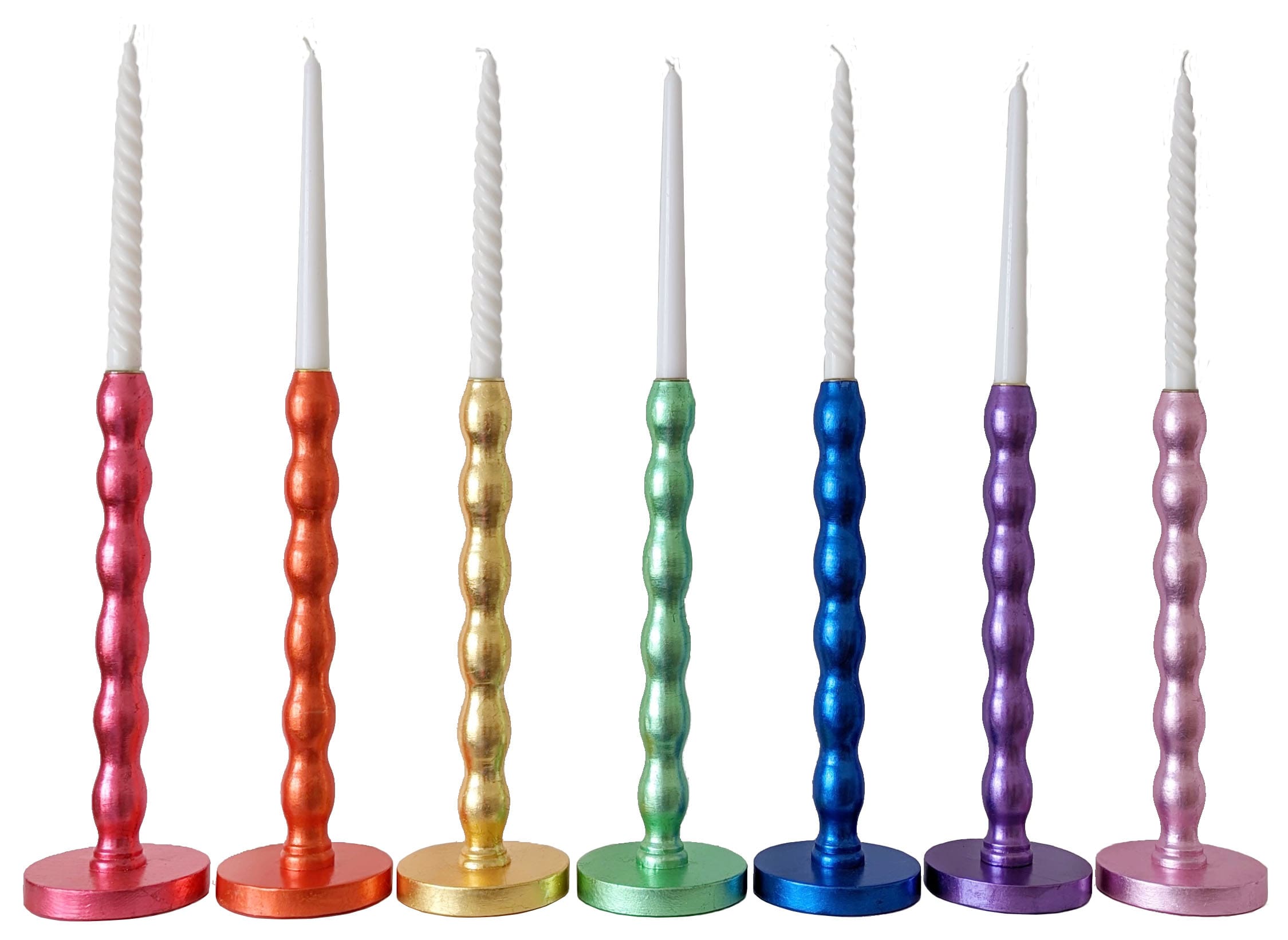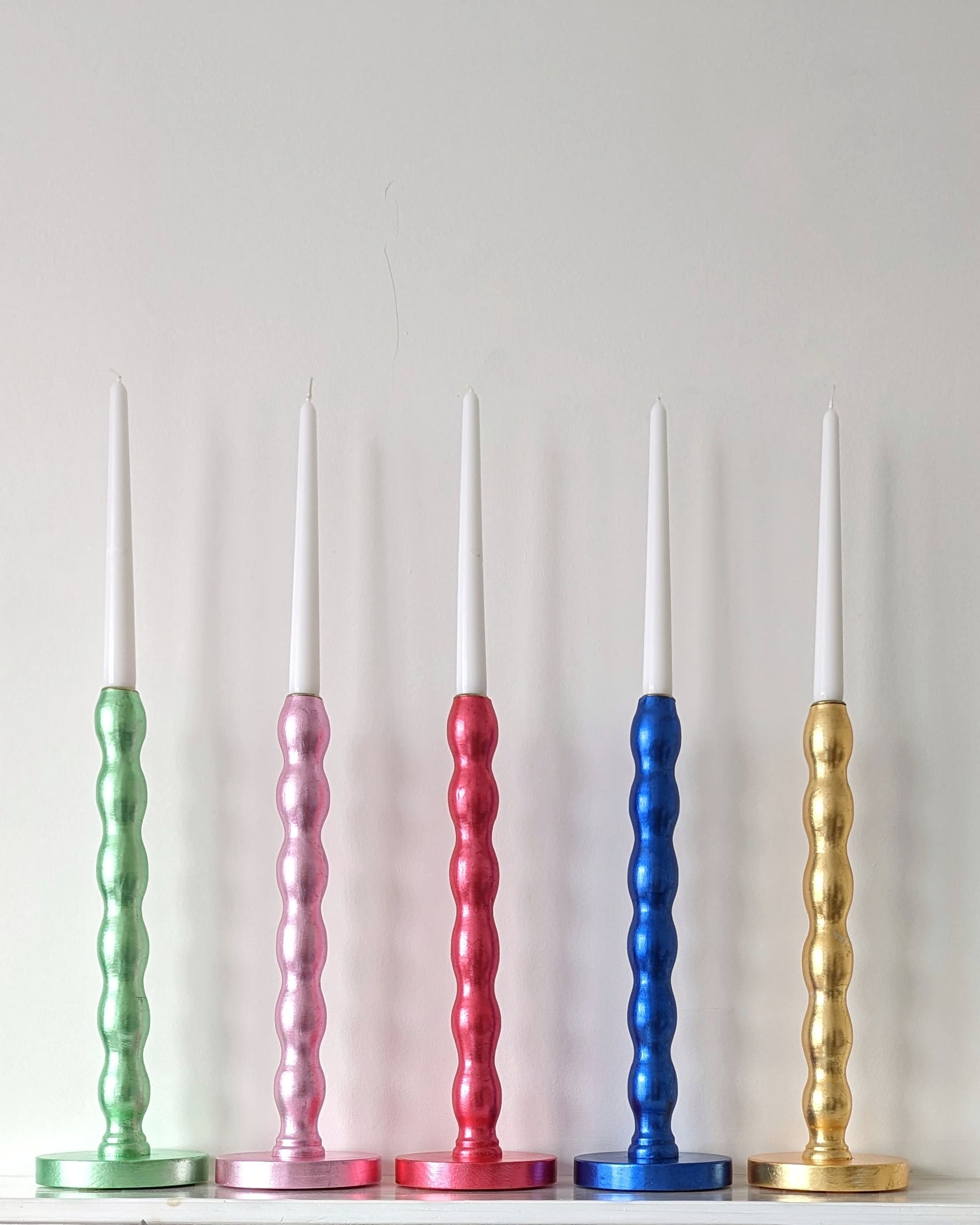This colourful, metallic candlestick collection has been designed to be mixed and matched, with all colours working well with each other. They are also a strong enough statement to work on their own and a number of designs can be bought in pairs. Please see our other listings for different styles. This Wavy Candlestick design is currently available in mint green, candy pink, scarlet red, royal blue and gold with only one of each colour.