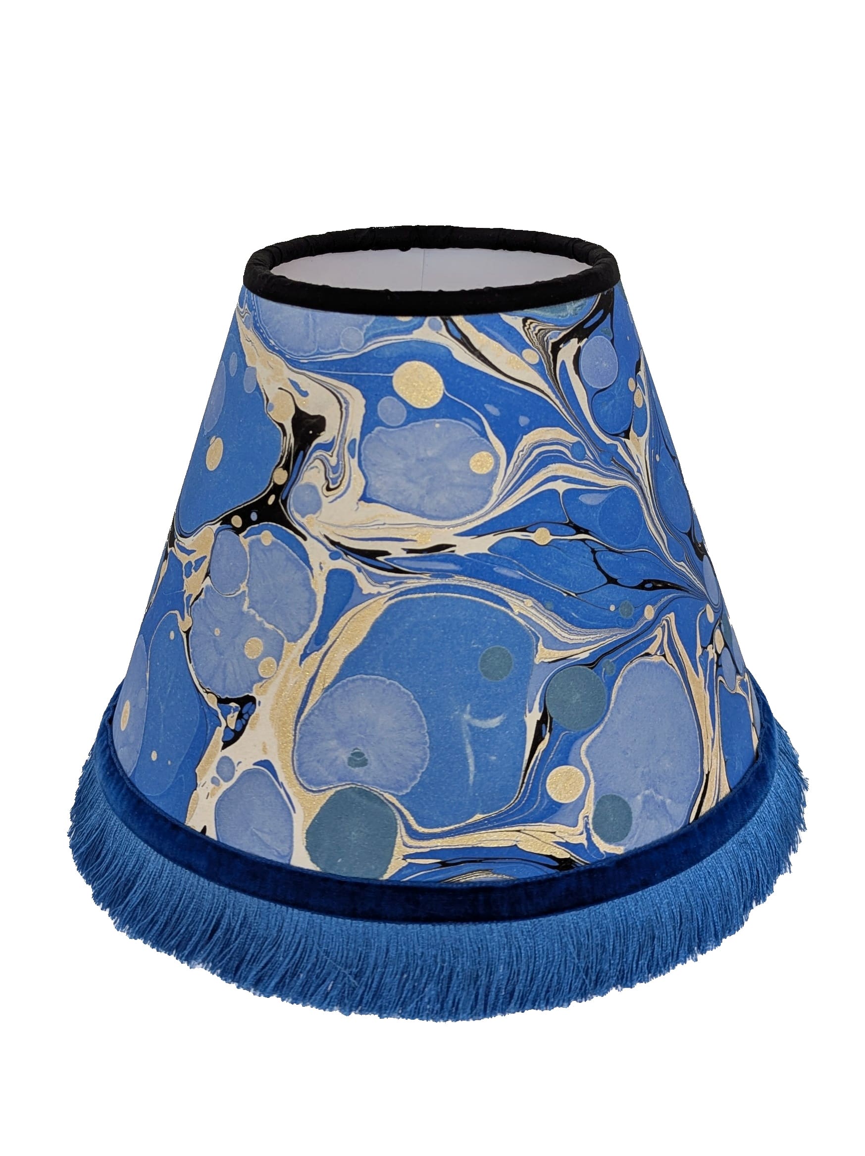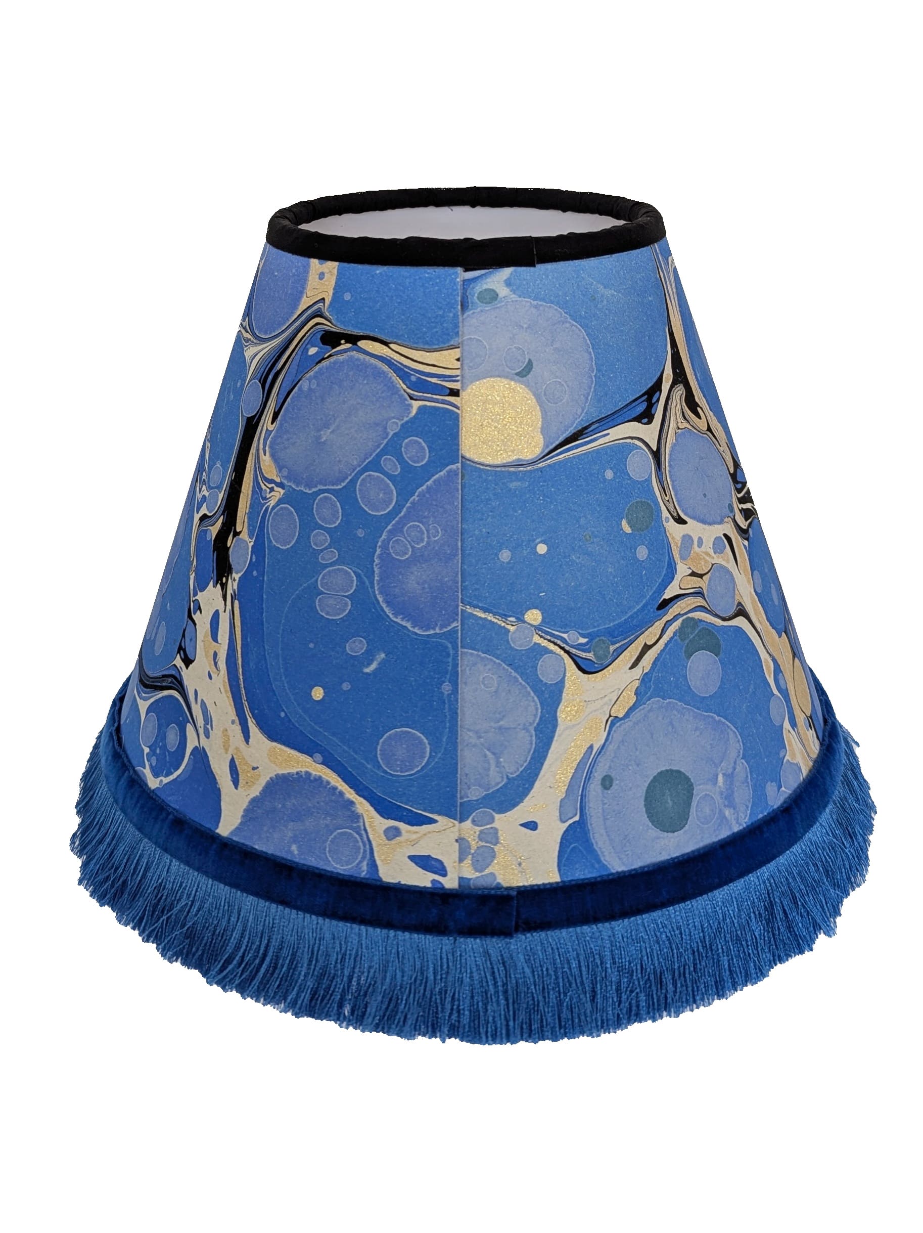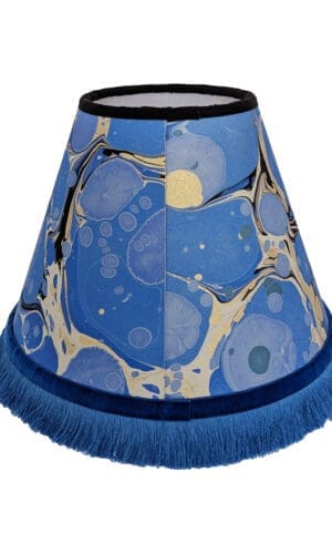 A one-off blue marbled lampshade handmade from original Ebru paper and backed with eco-friendly cardboard. Finished with a velvet ribbon and silky fringe for a luxurious, vintage-inspired look. Lamp base sold separately.