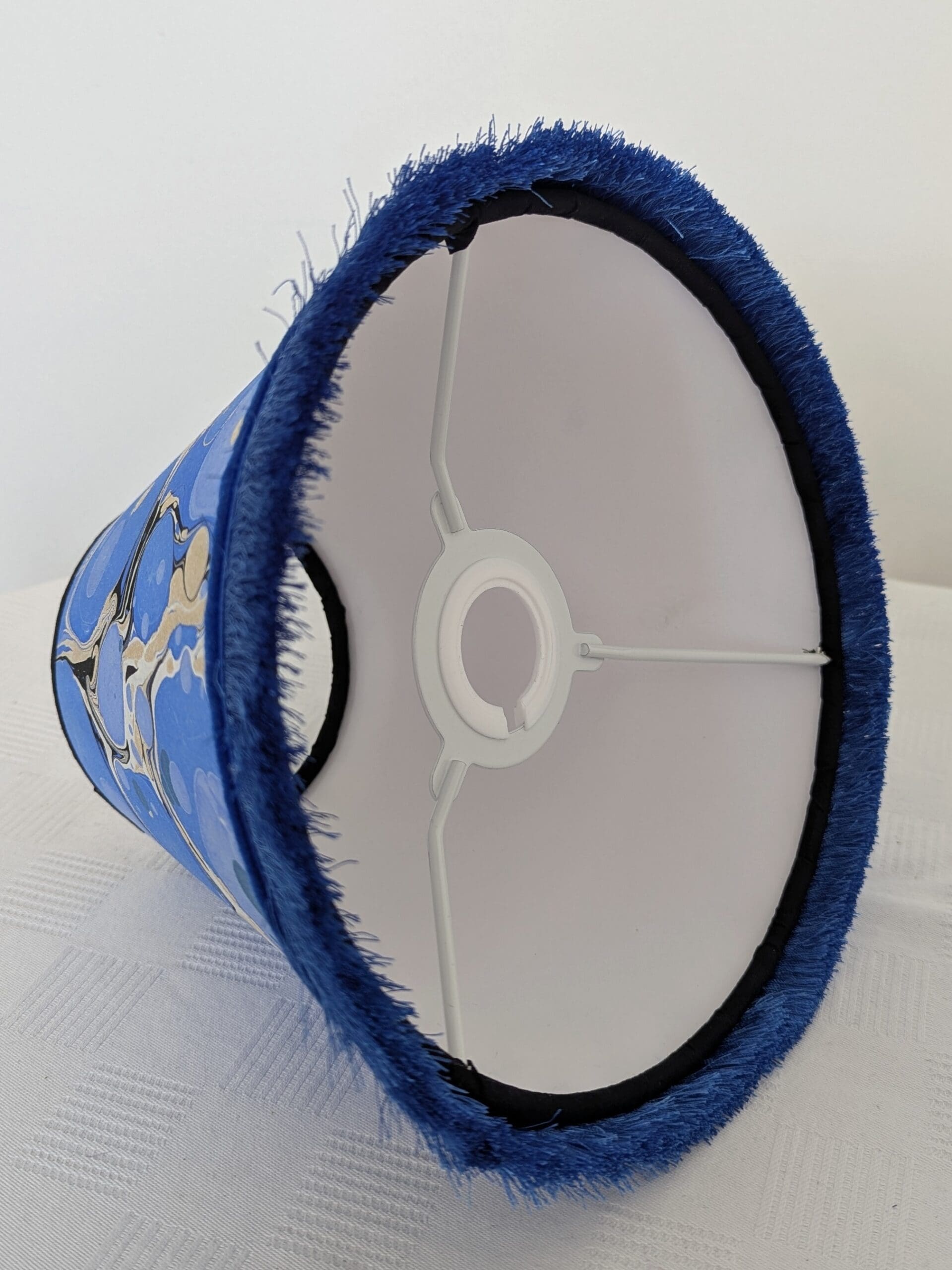 Blue Marbled Lampshade – Handmade with Ebru Paper, Velvet Trim & Sustainable Backing