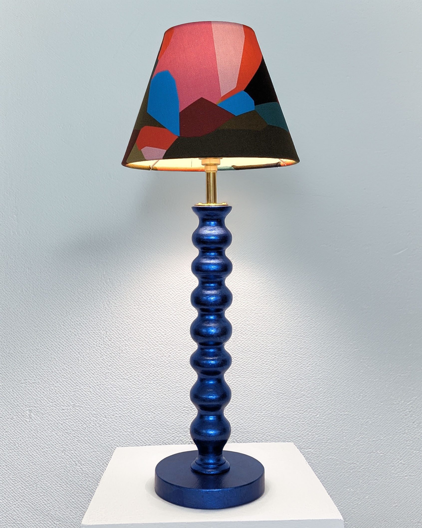 Handmade geometric pattern lampshade in colourful fabric by Kitty McCall. Sustainably made in Margate from remnant fabric for table and desk lamps.