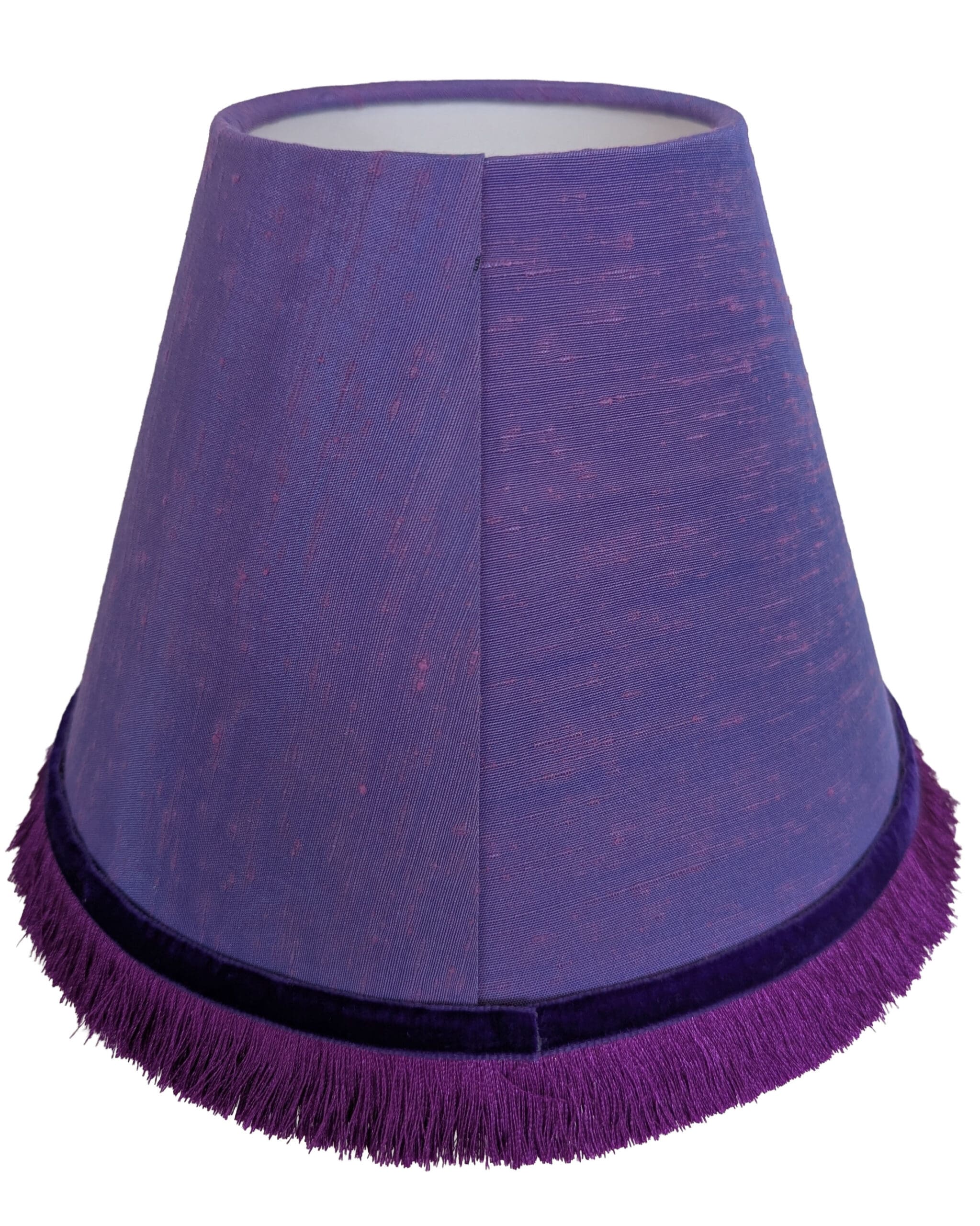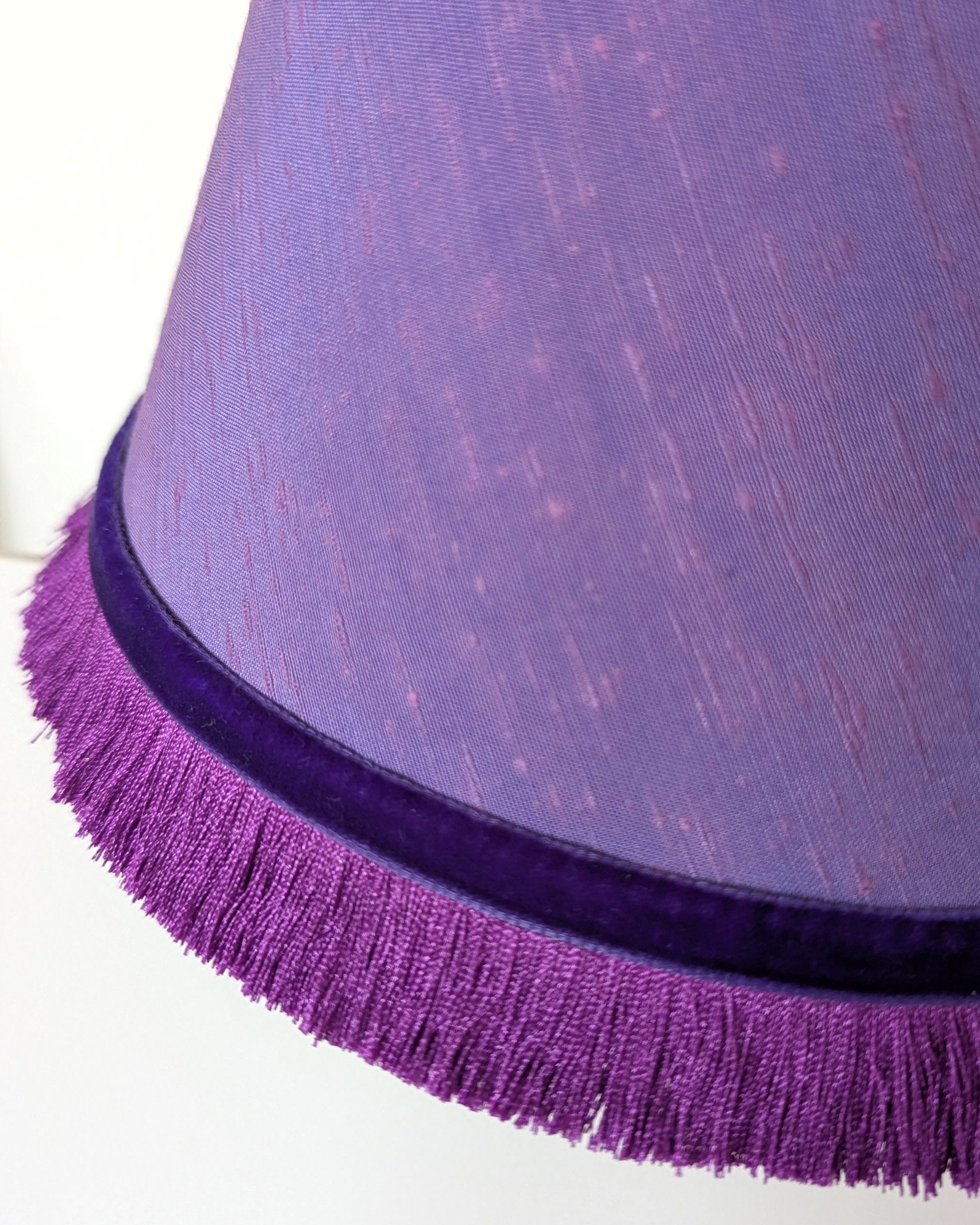 Elevate your lighting with this handmade conical lampshade, crafted from a richly textured purple fabric with a subtle iridescence. The shade is finished with a vibrant plum coloured silky fringe and velvet ribbon trim, adding softness and contrast. The lampshade has been made with a white card panel, rather than the typical vinyl, adding to its sustainability credentials.