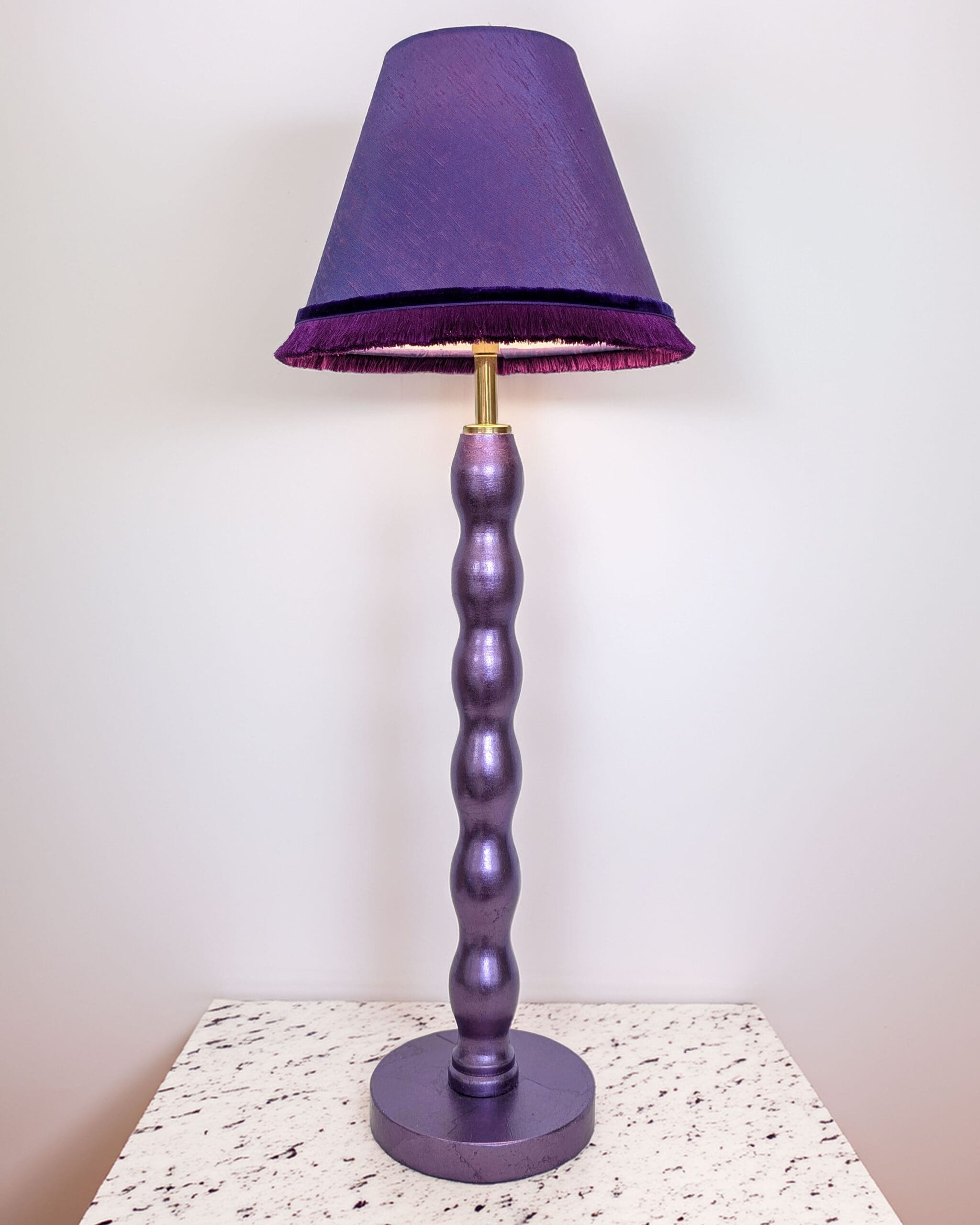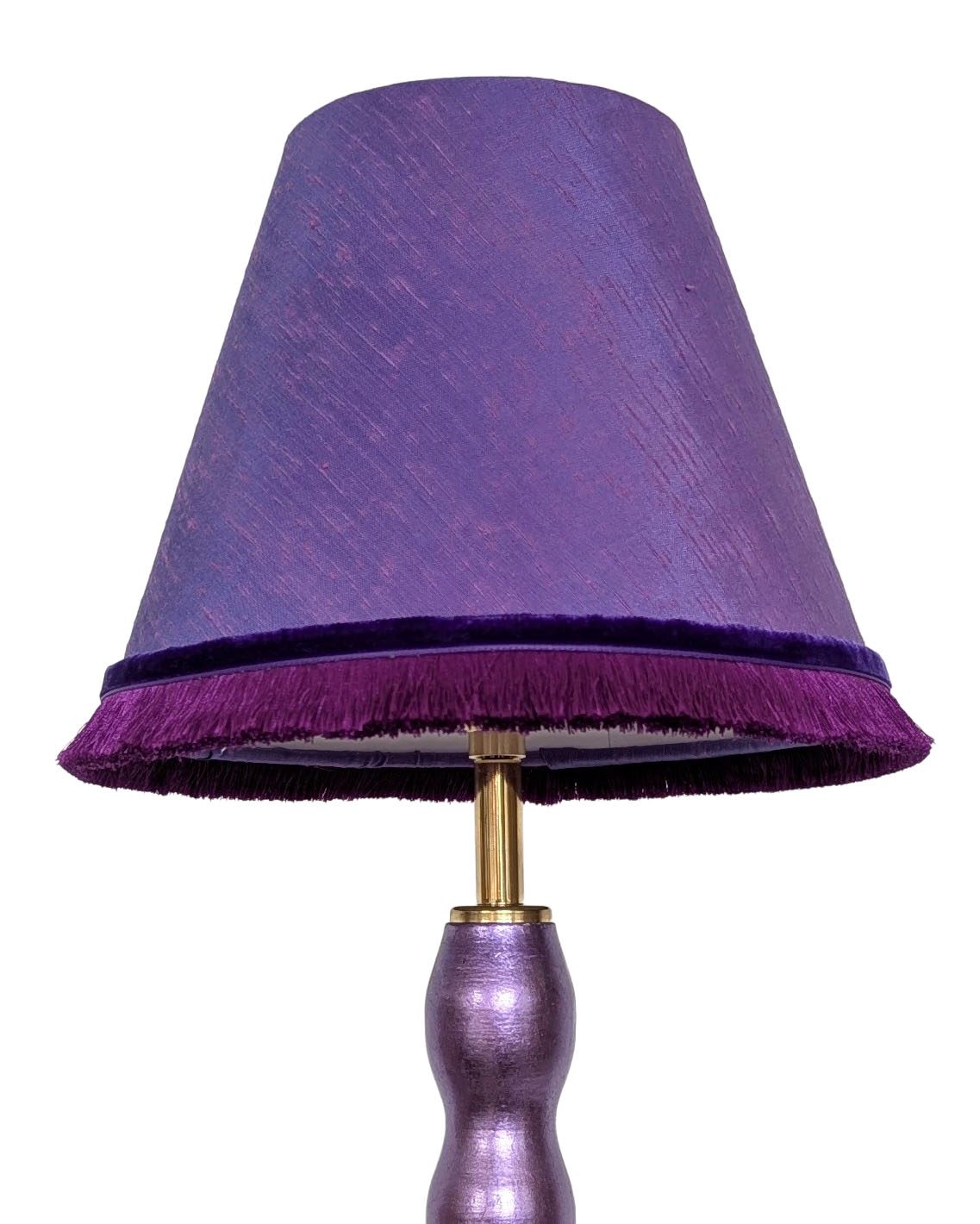 Handmade purple fabric lampshade with fringe trim. Sustainably made in Margate from remnant fabric for table and desk lamps.