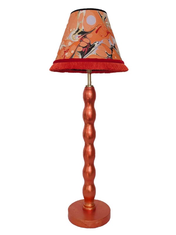This one-of-a-kind lamp is handmade from a reclaimed vintage wavy bobbin chair leg, giving it a second life while reducing environmental impact. The base has been gilded by hand using genuine orange dyed silver leaf, then sealed with varnish for a soft, luminous sheen. Natural variations in the silver leaf create a beautiful textured finish.
