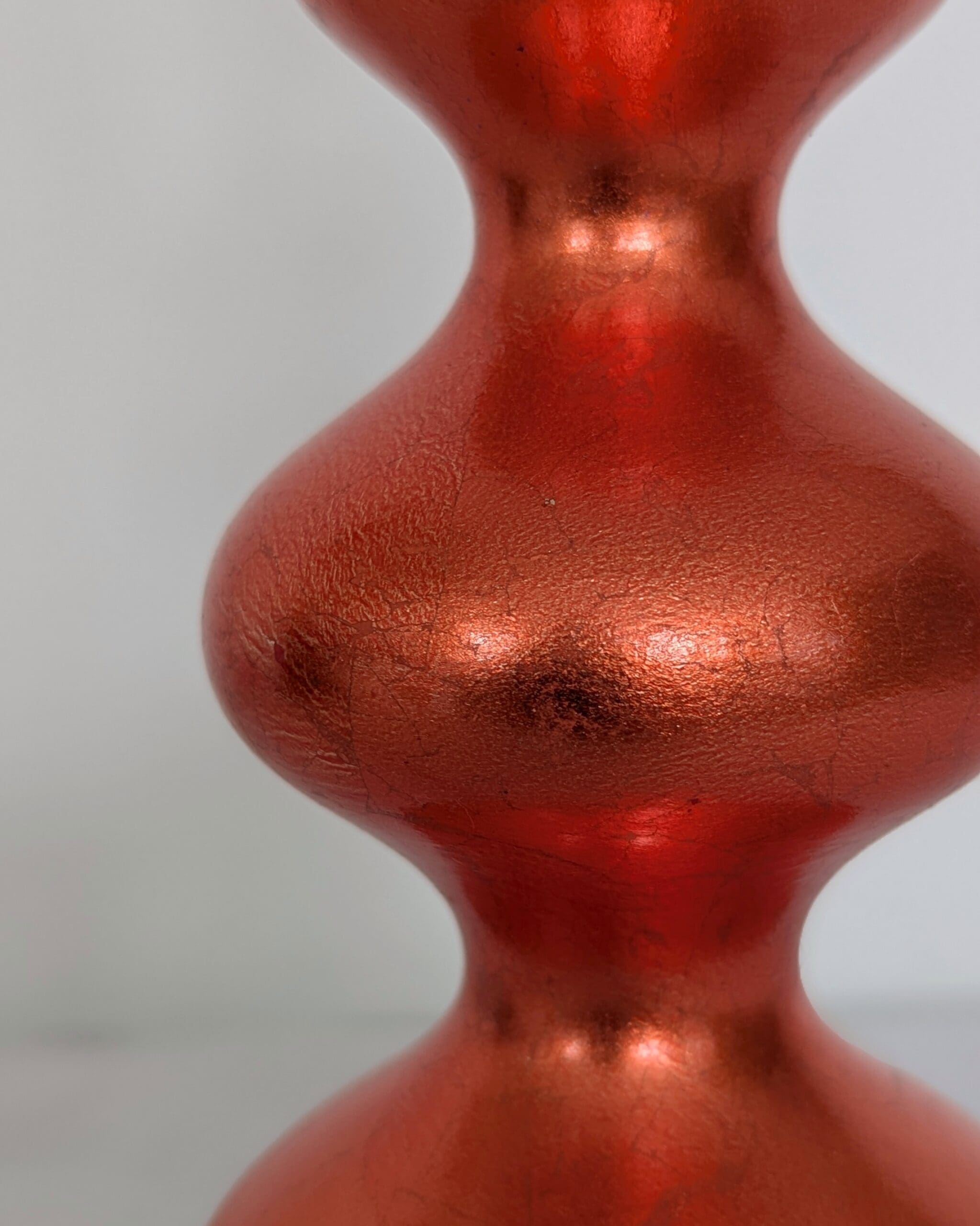 This one-of-a-kind lamp has be refinished and rewired giving it a second life while reducing environmental impact. The base has been gilded by hand using genuine orange dyed silver leaf, then sealed with varnish for a soft, luminous sheen. Natural variations in the silver leaf create a beautiful textured finish.