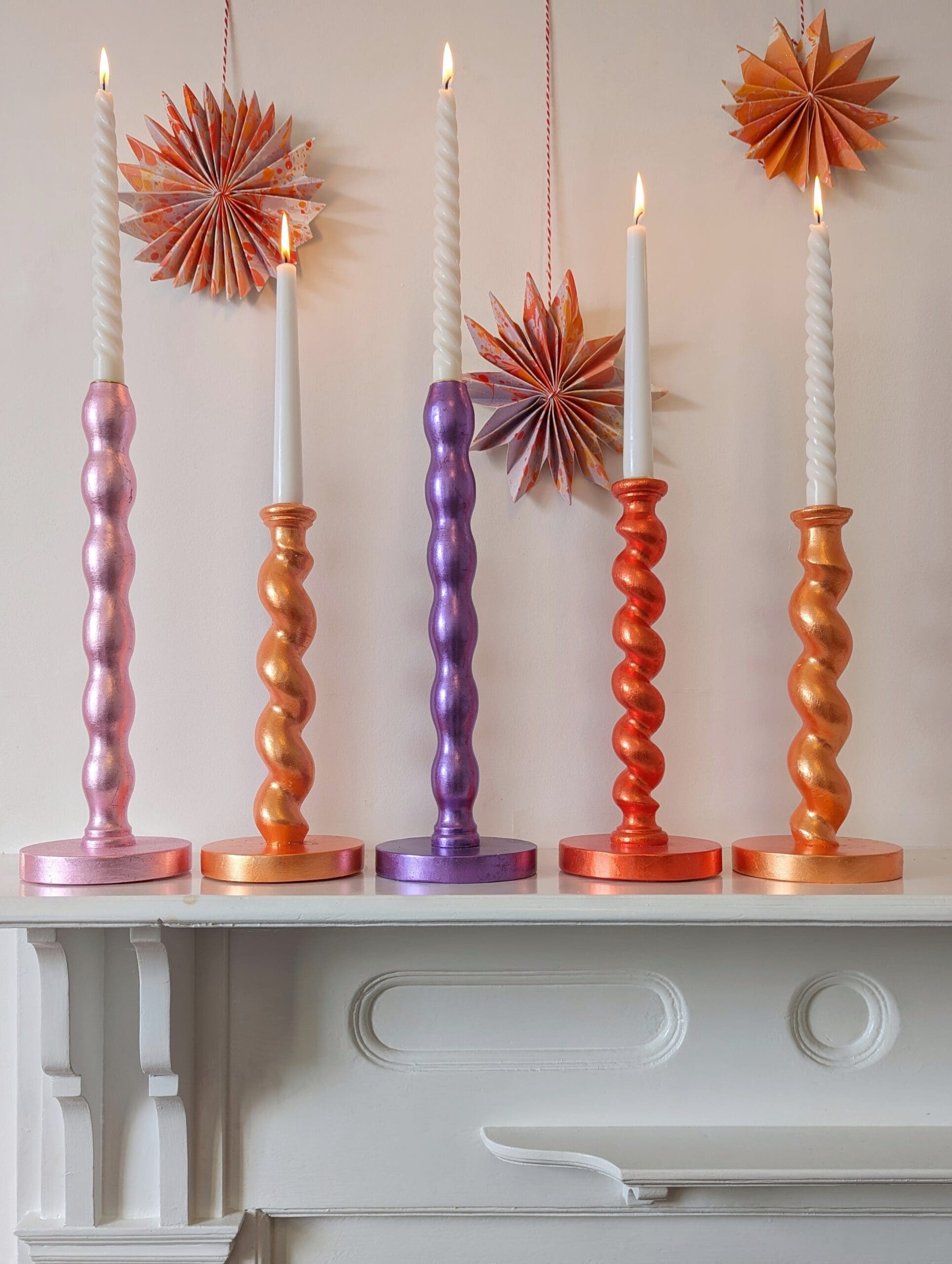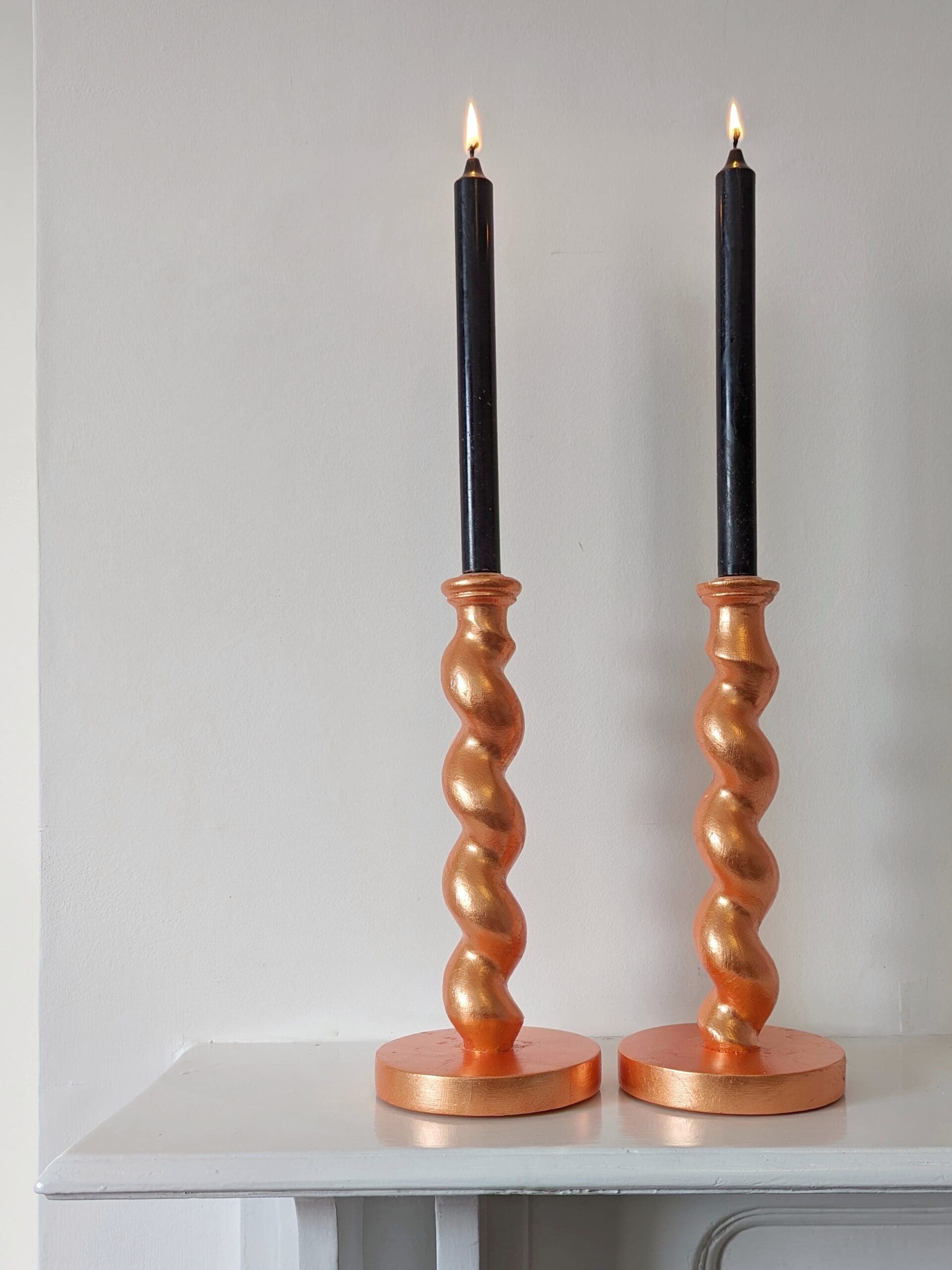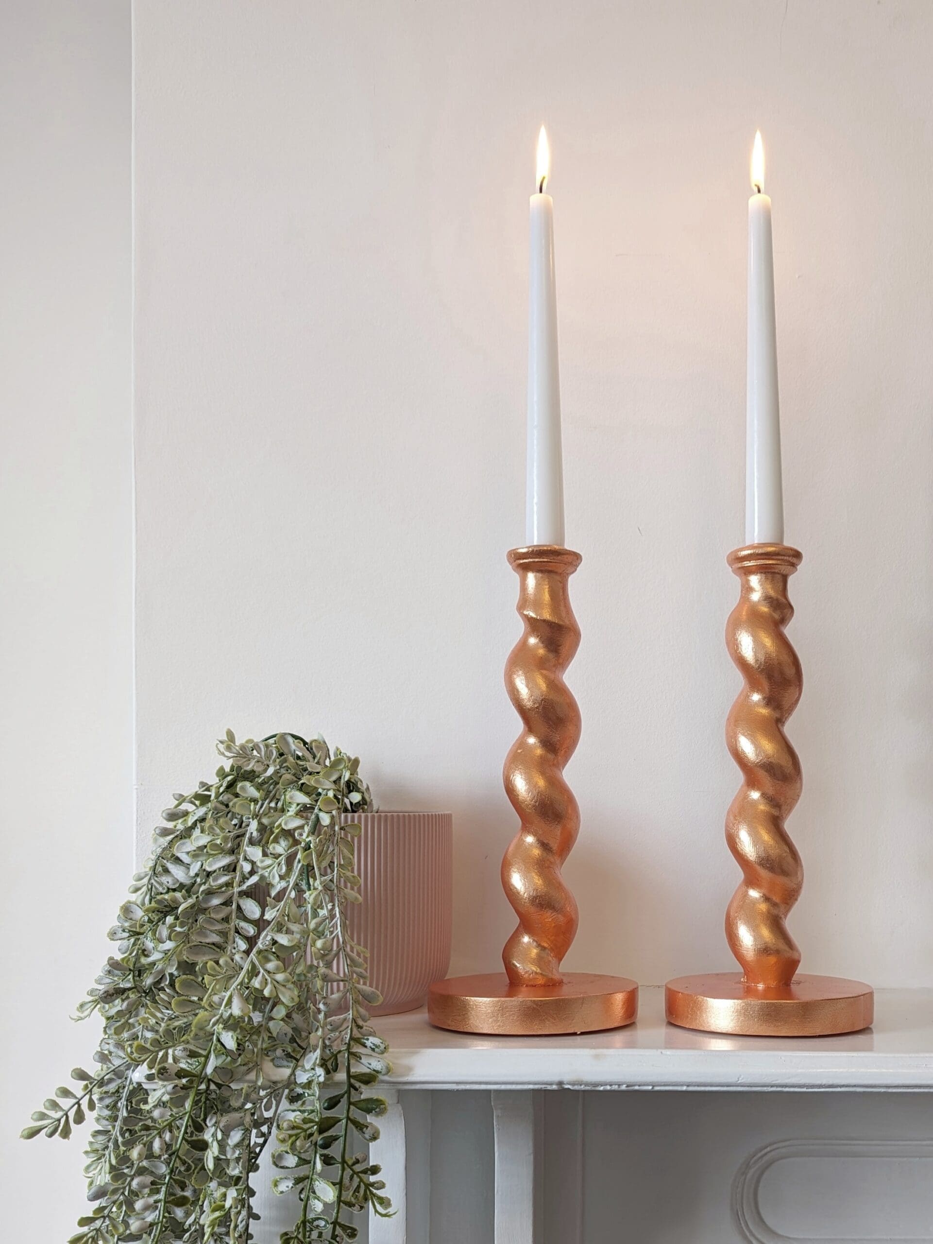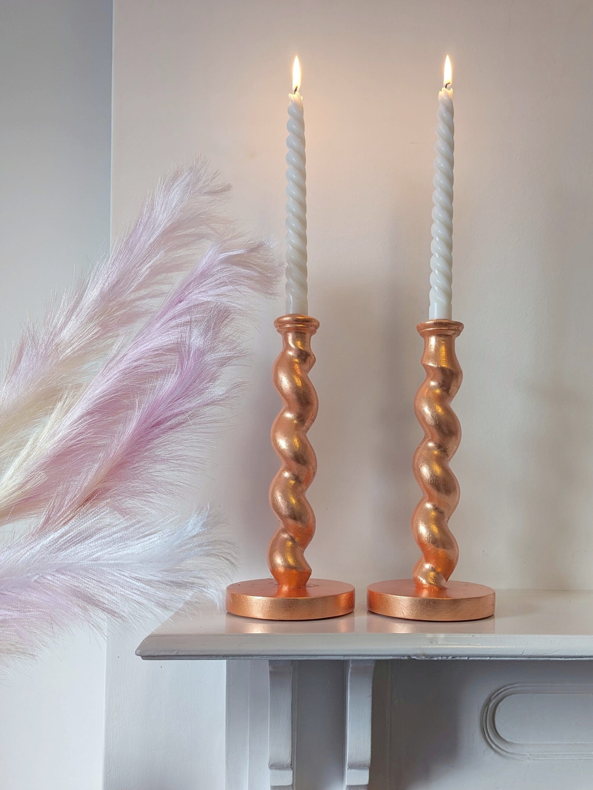 These luxury, sustainable candlesticks have been handcrafted from reclaimed antique barleytwist chair legs. They have been gilded with silver leaf which has been carefully applied by hand and varnished for protection. The luxurious metallic finish is a dyed genuine silver leaf in a peach colour which has a beautiful soft sheen and natural variations in colour.