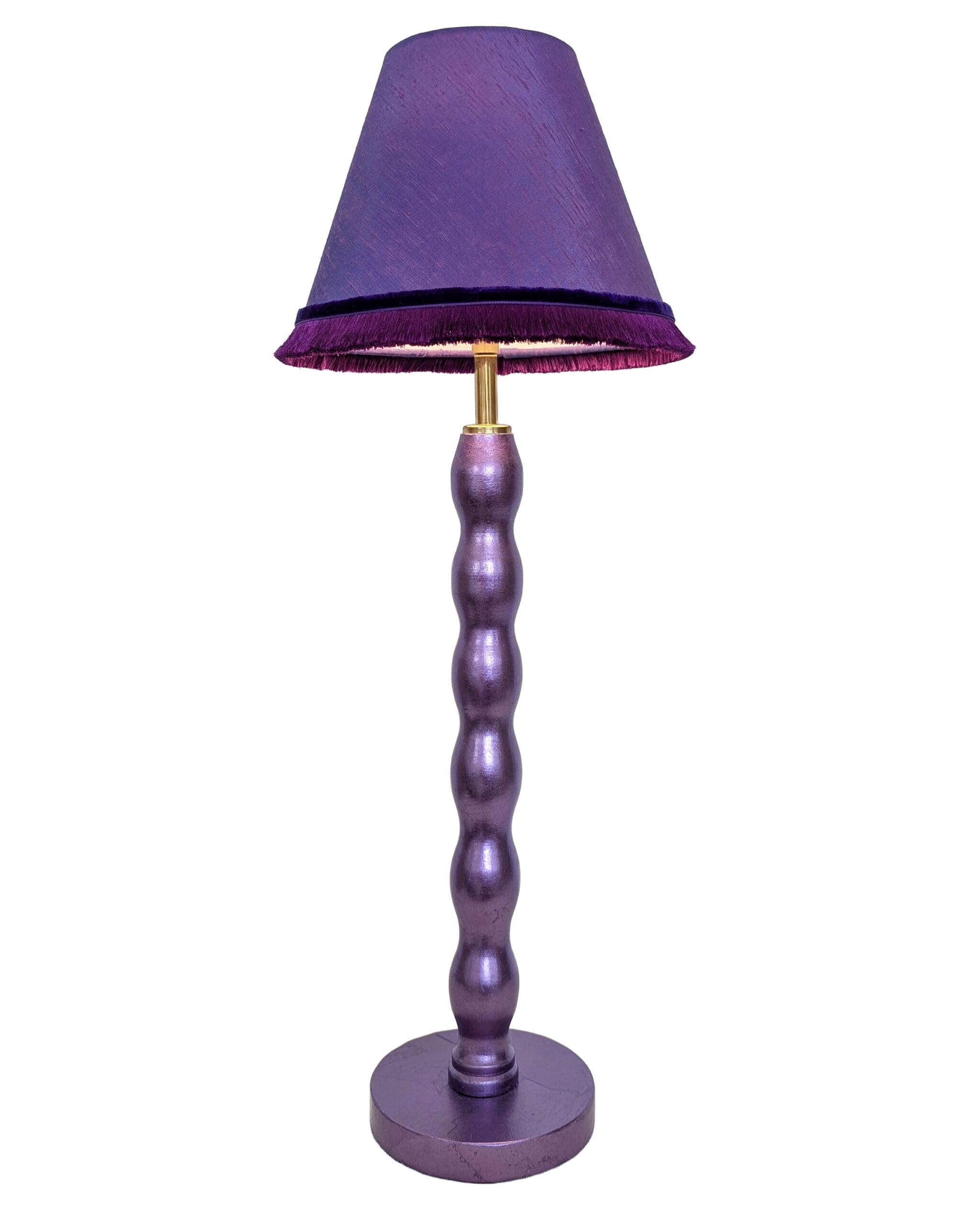 This one-of-a-kind lamp is handmade from a reclaimed vintage wavy bobbin chair leg, giving it a second life while reducing environmental impact. The base has been gilded by hand using genuine purple dyed silver leaf, then sealed with varnish for a soft, luminous sheen. Natural variations in the silver leaf create a beautiful textured finish.